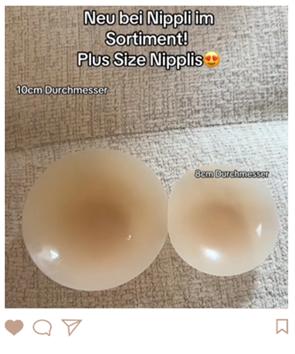 I copricapezzoli vincitori del confronto, Nippli, sono disponibili in due misure: con un diametro di 8 cm e con un diametro extra large di 10 cm. In questo modo, ogni forma e dimensione del seno può indossare comodamente i copricapezzoli, senza segni sotto i vestiti o il timore che si spostino.