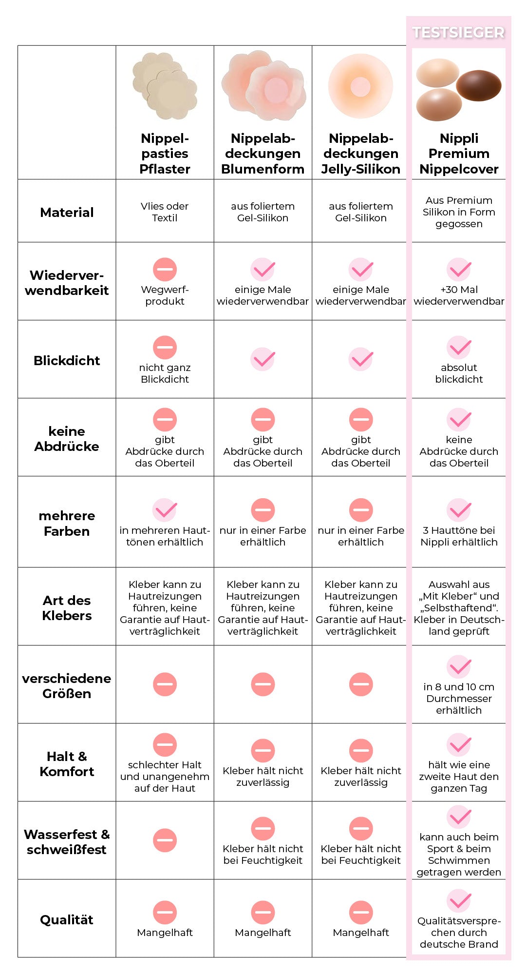 Esistono innumerevoli tipi di copricapezzoli o nippelpads sul mercato, alcuni di marchi noti, altri di produttori senza nome. Variano per materiali, forme e dimensioni. Quali offrono tutti i vantaggi per ogni occasione? Quali sono davvero validi? Quale prodotto non solo copre i capezzoli, ma soddisfa anche tutte le esigenze? Anche la qualità può variare molto. Alcuni copricapezzoli non svolgono adeguatamente la loro funzione, sono riutilizzabili solo una volta o risultano visibili sotto i vestiti. Per questo motivo, è fondamentale sapere in anticipo quali sono i migliori. Iniziamo con il grande test sui copricapezzoli!